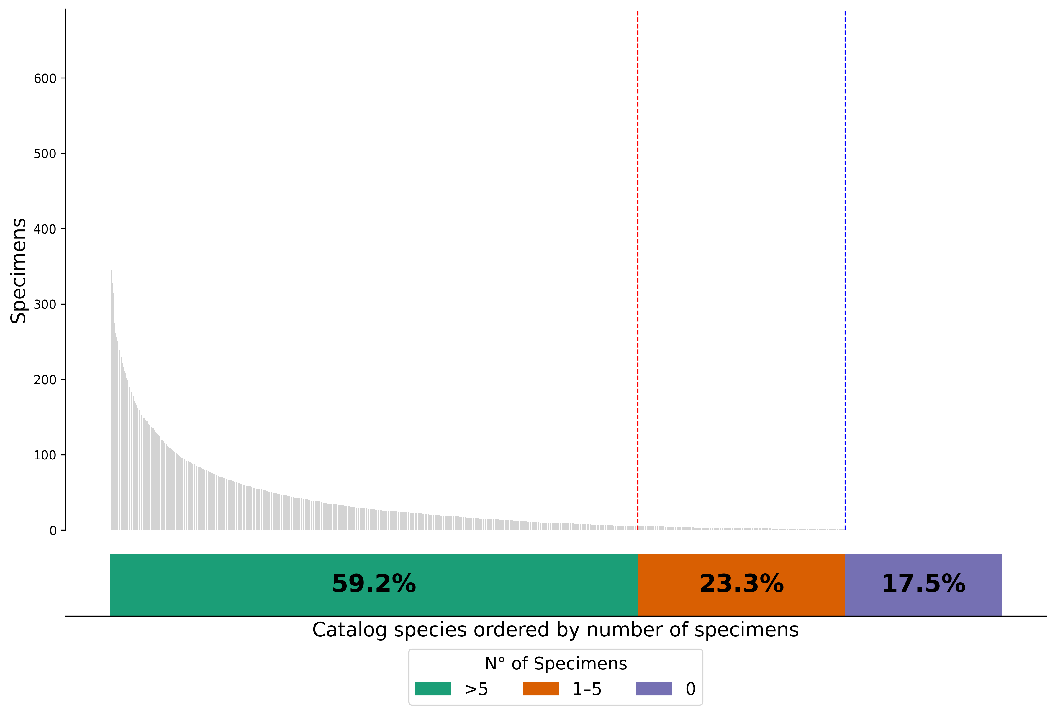 Figura 1. Distribución del número de especímenes digitalizados por especie, en relación con las especies descritas en el Catálogo de las Plantas Vasculares de Chile. Las barras se dividen en tres segmentos: especies con más de 5 especímenes digitalizados; especies con entre 1 y 5 especímenes; y especies que aún no cuentan con especímenes digitalizados.